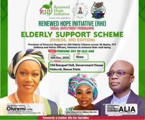 Since 2023, the Renewed Hope Initiative has consistently celebrated elderly citizens every December as a mark of appreciation for their sacrifices. On Tuesday, December 16, 2025, the RHI held the third edition of such intervention – the Elderly Support Scheme – in Benue State at the Old Banquet Hall, Government House, Makurdi, with the theme “Finding Joy in Old Age”.